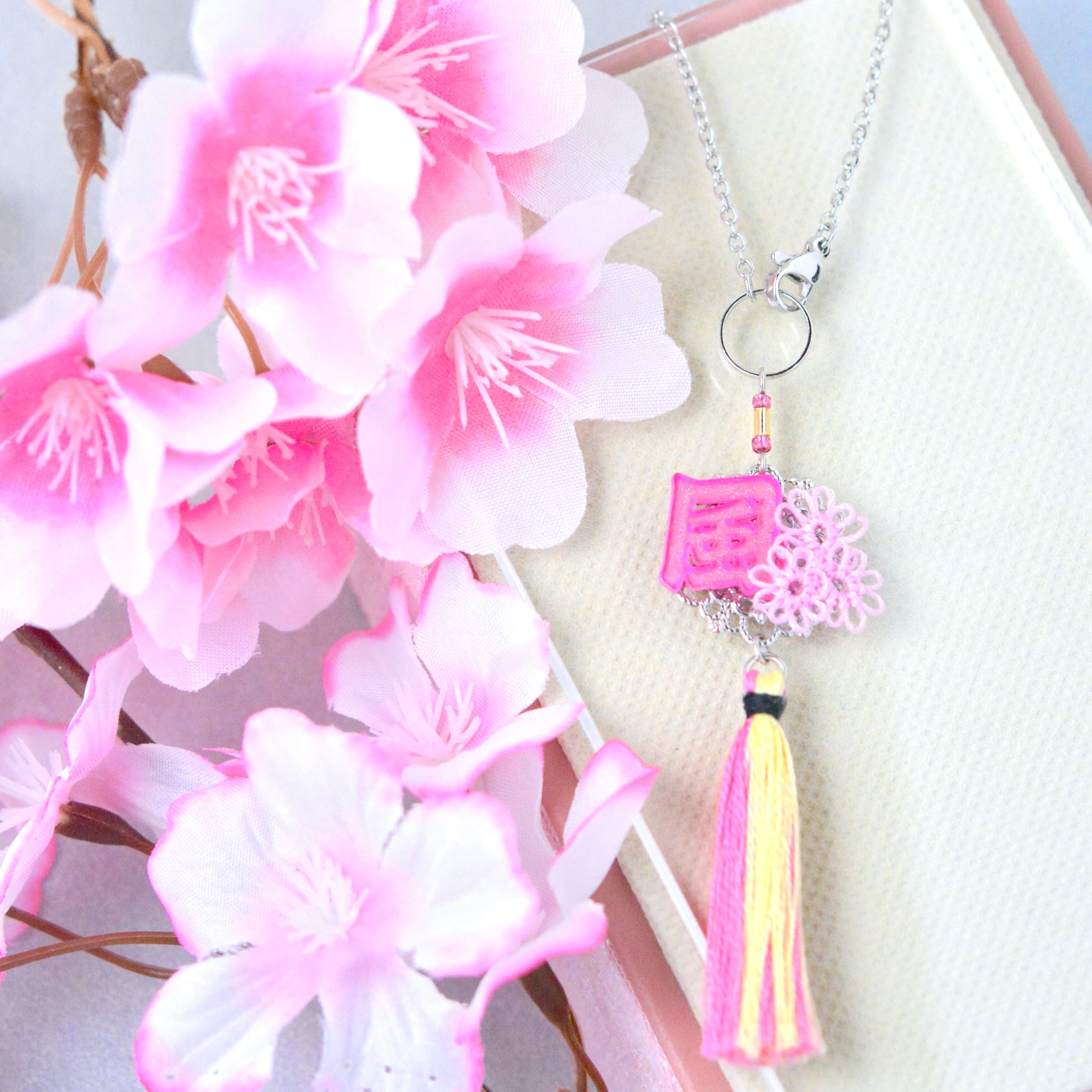 漢字部分にはお花を模したピンクのレース、そして漢字の下にはスプブリをイメージしたカラーのタッセルを合わせました。