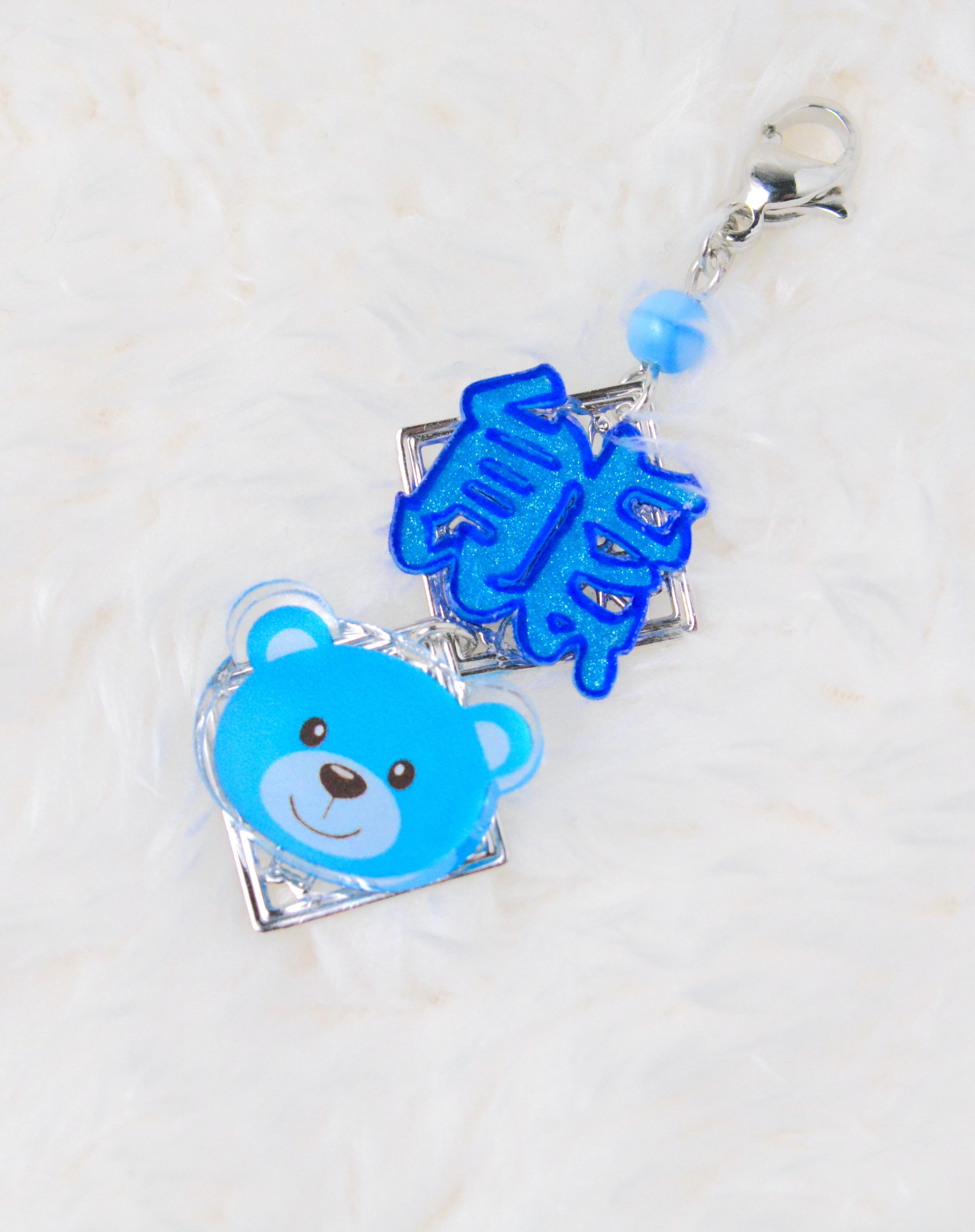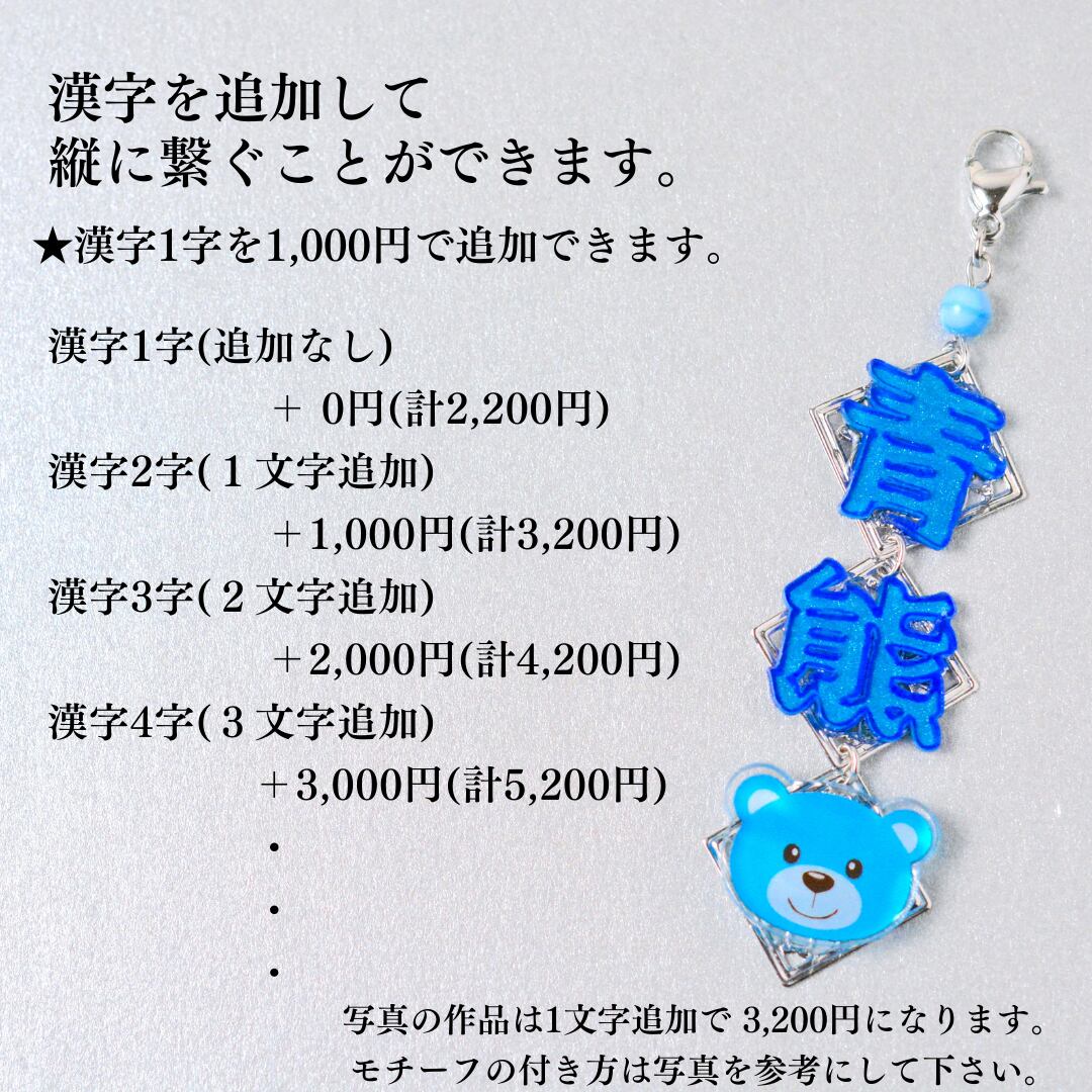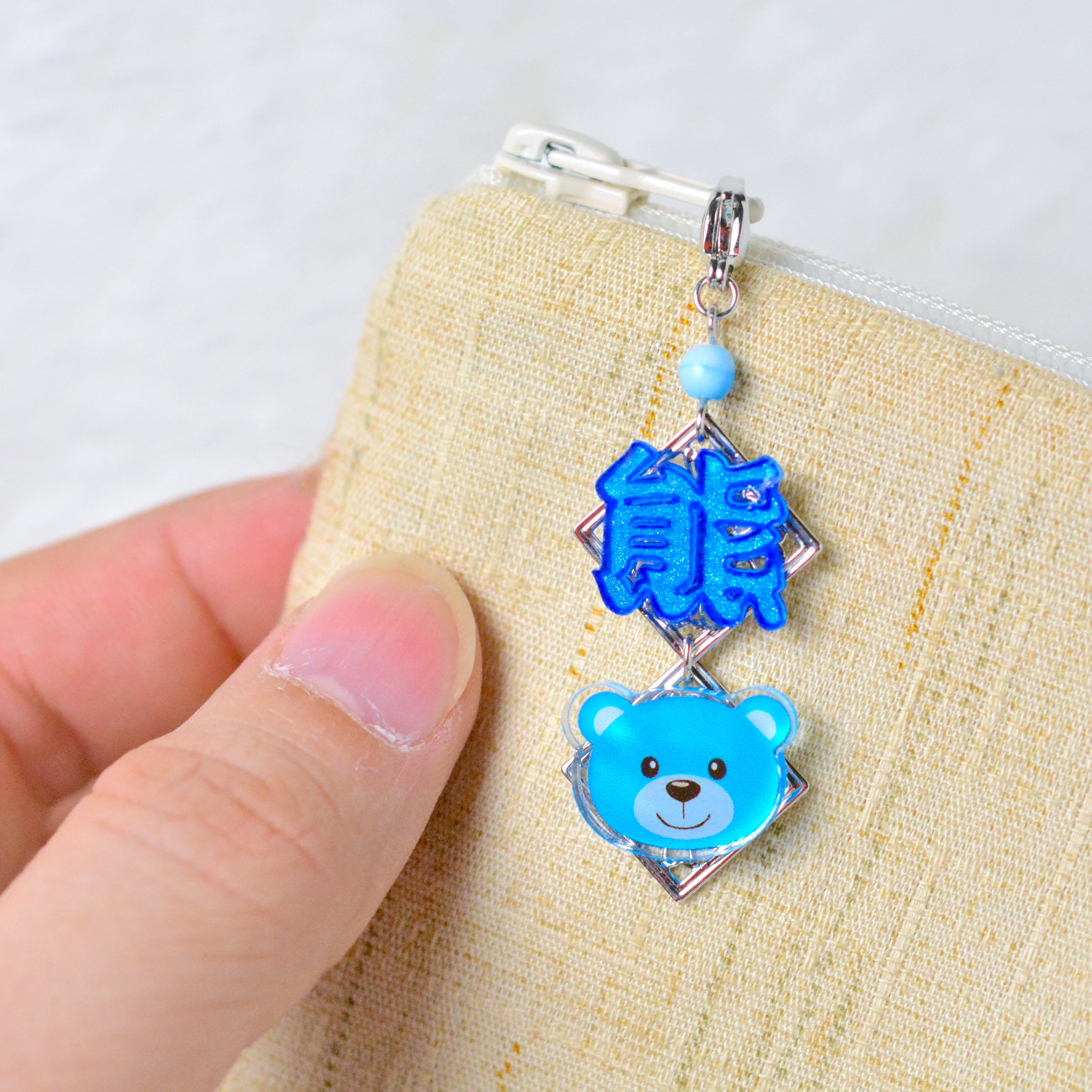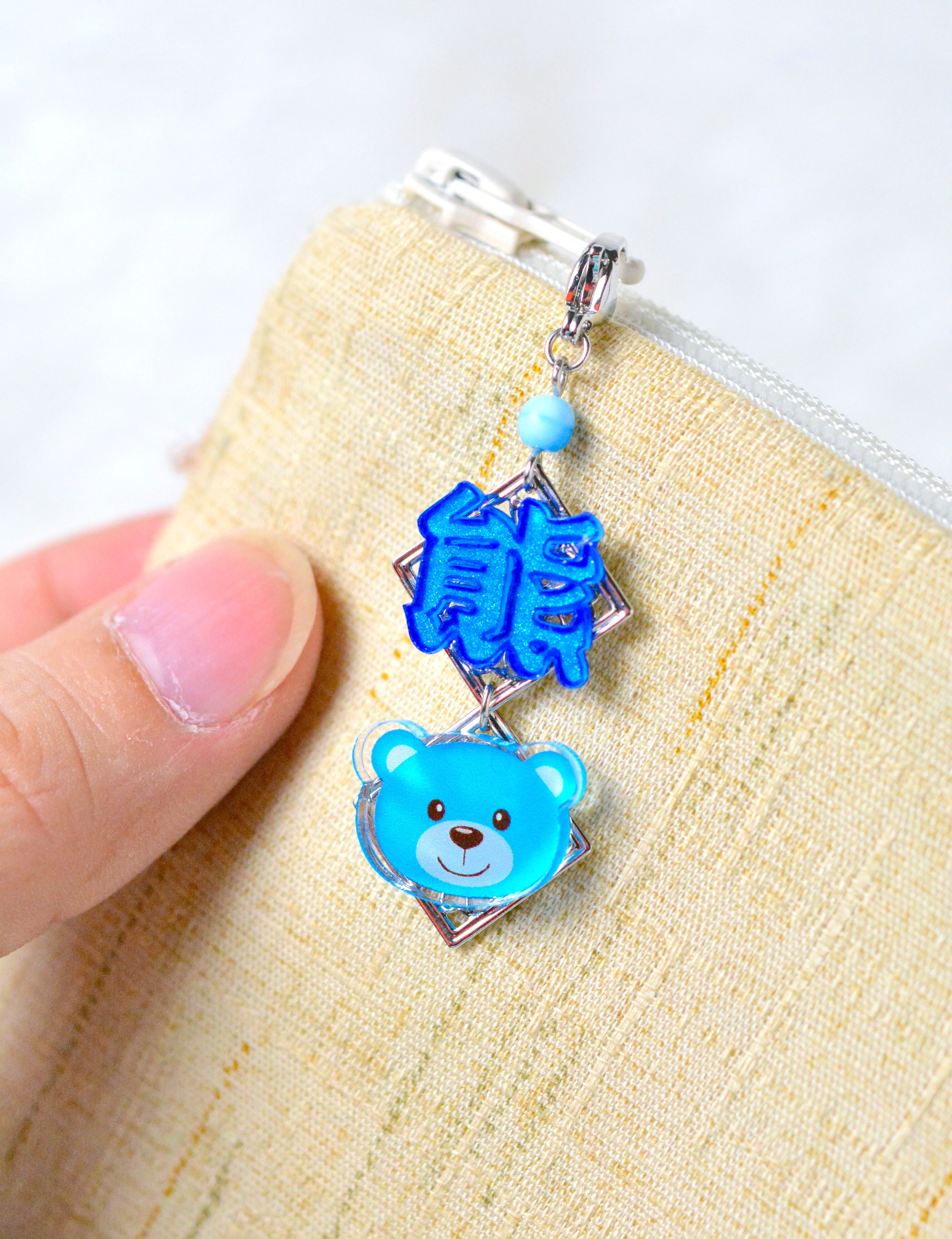 青い熊のかわいい顔のプレートと漢字を合わせたチャームです!