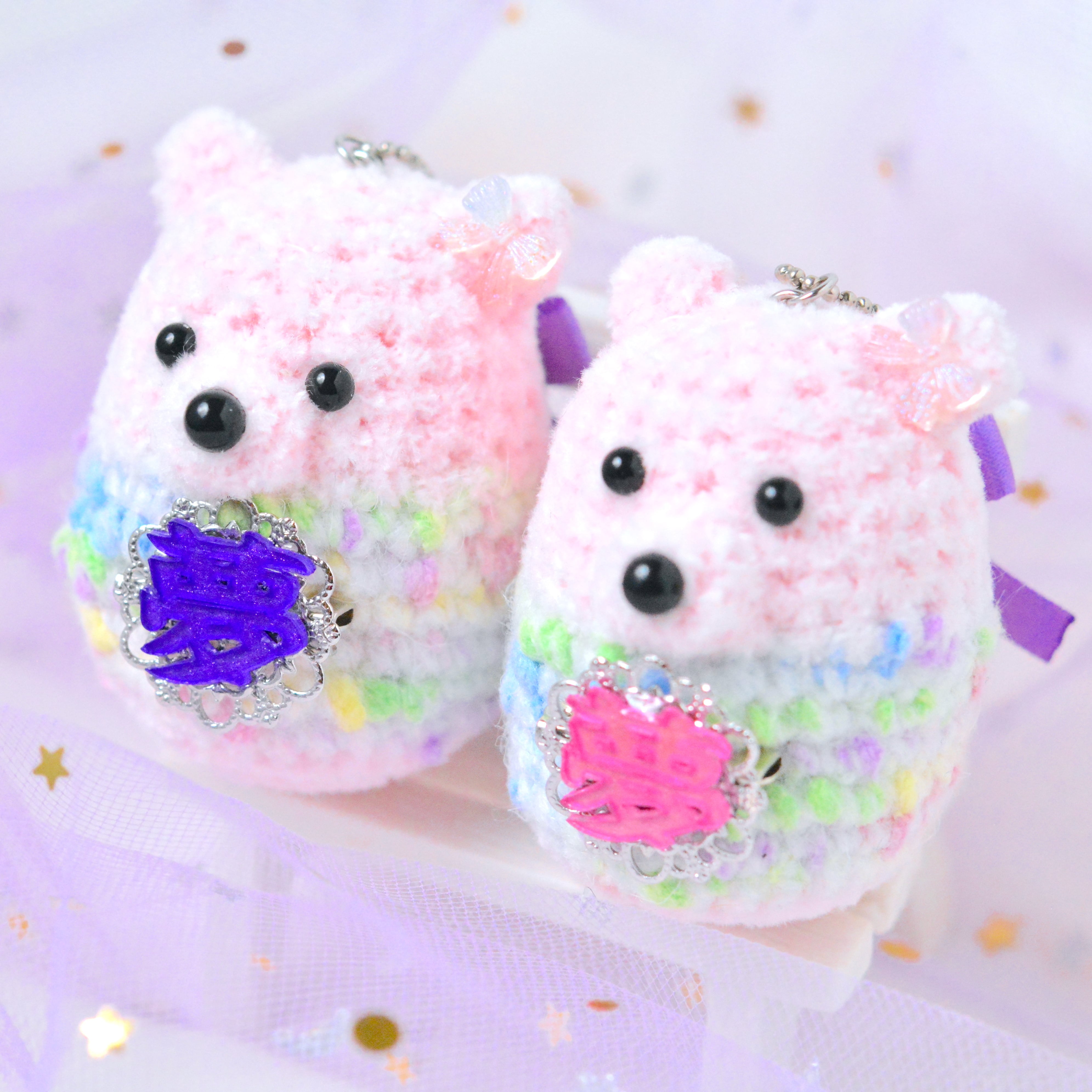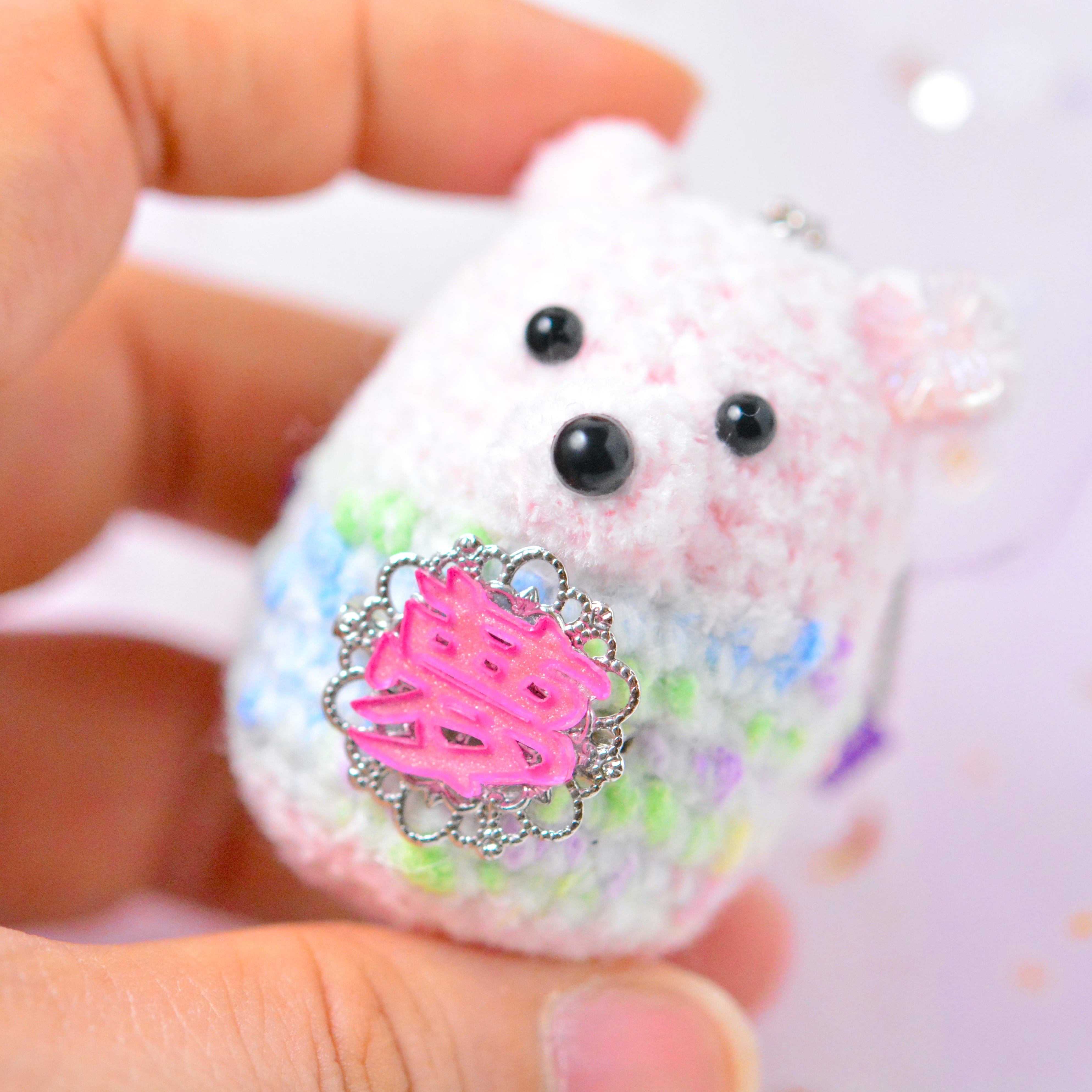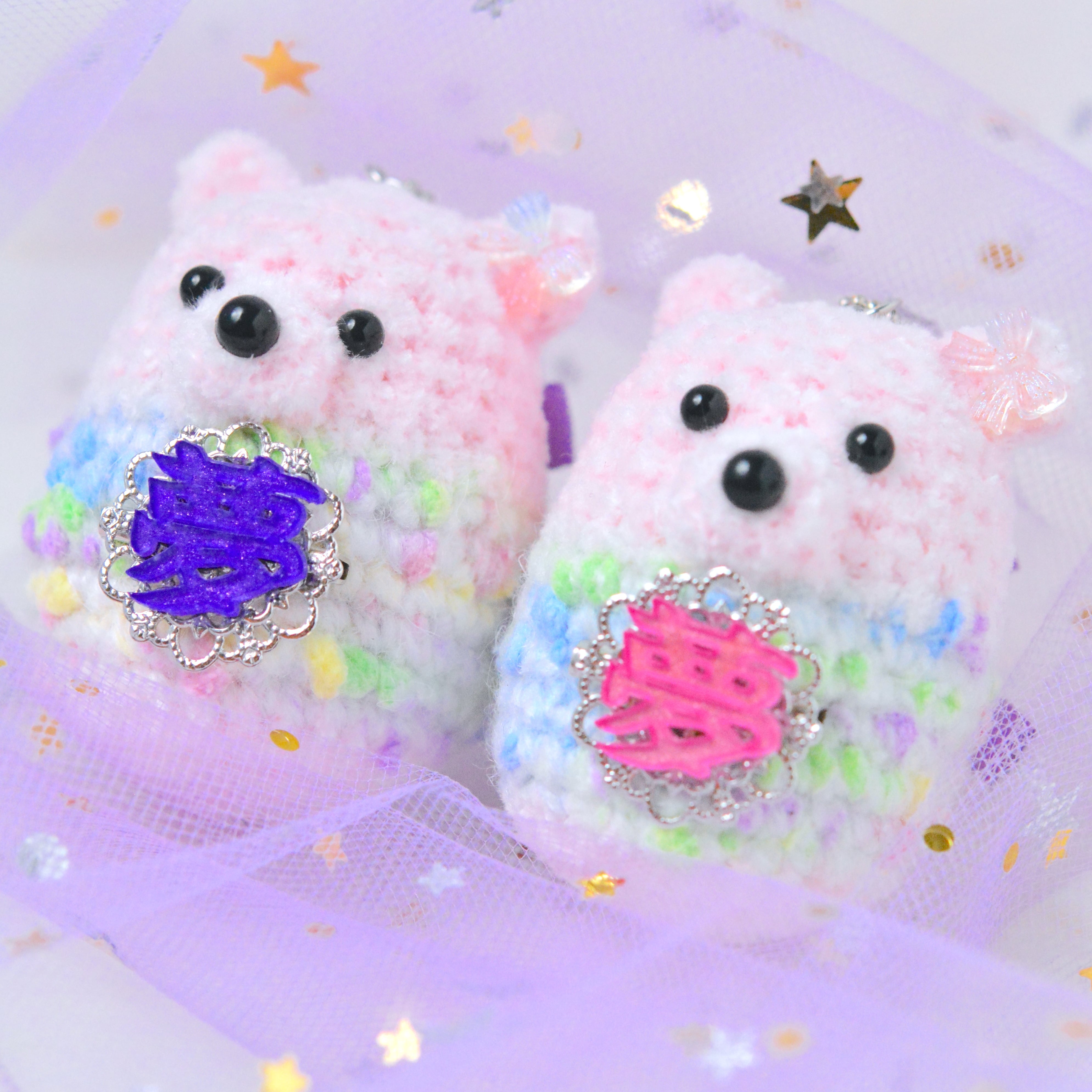 手のひらサイズのクマのあみぐるみです。お腹の部分にBLUE BEARの漢字のバッジが1つ付くようになっていて、お好きな文字・推しの文字などを付けて楽しんで頂けます!!
