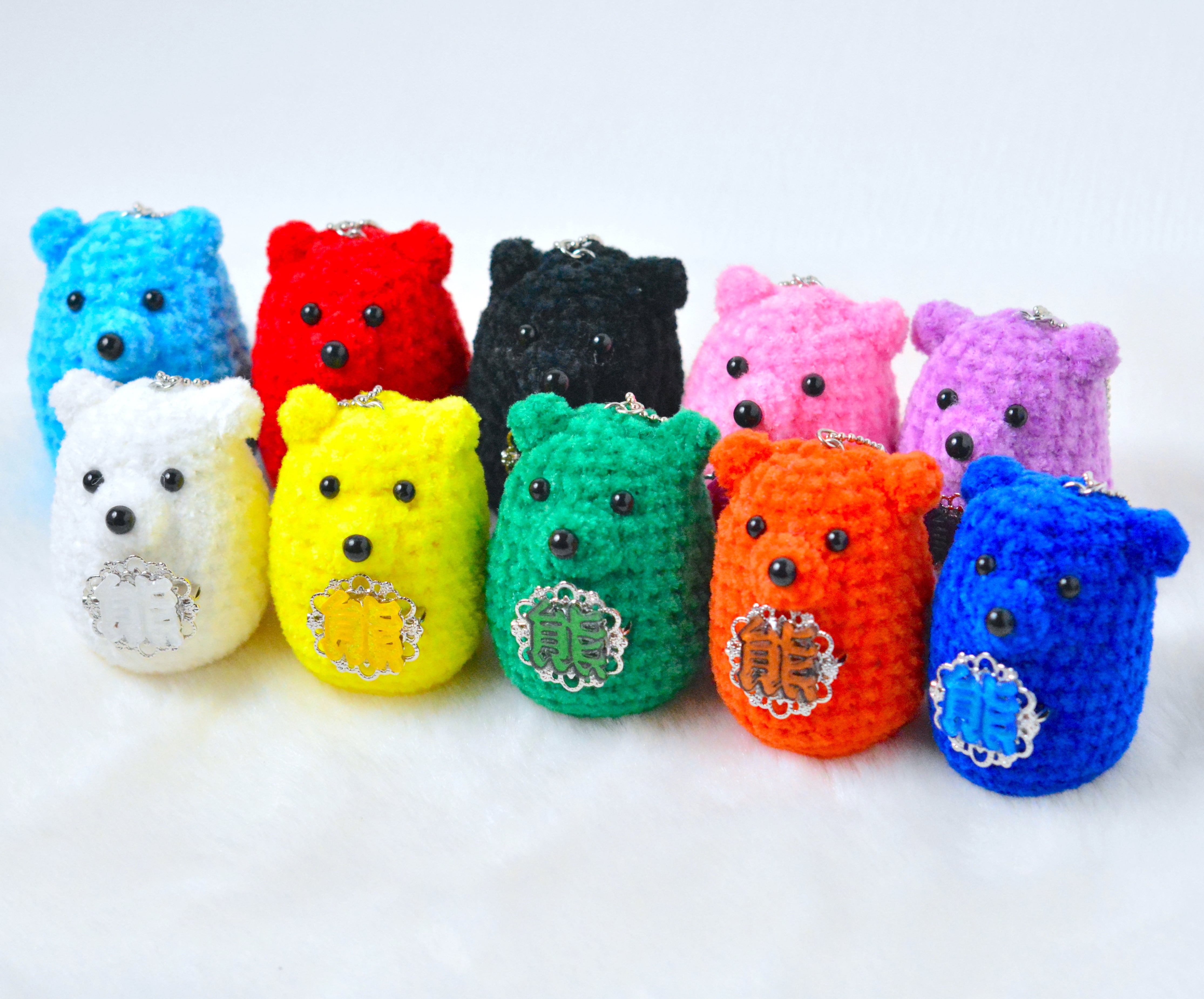 手のひらサイズのクマのあみぐるみです。お腹の部分にBLUE BEARの漢字のバッジが1つ付くようになっていて、お好きな文字・推しの文字などを付けて楽しんで頂けます!!