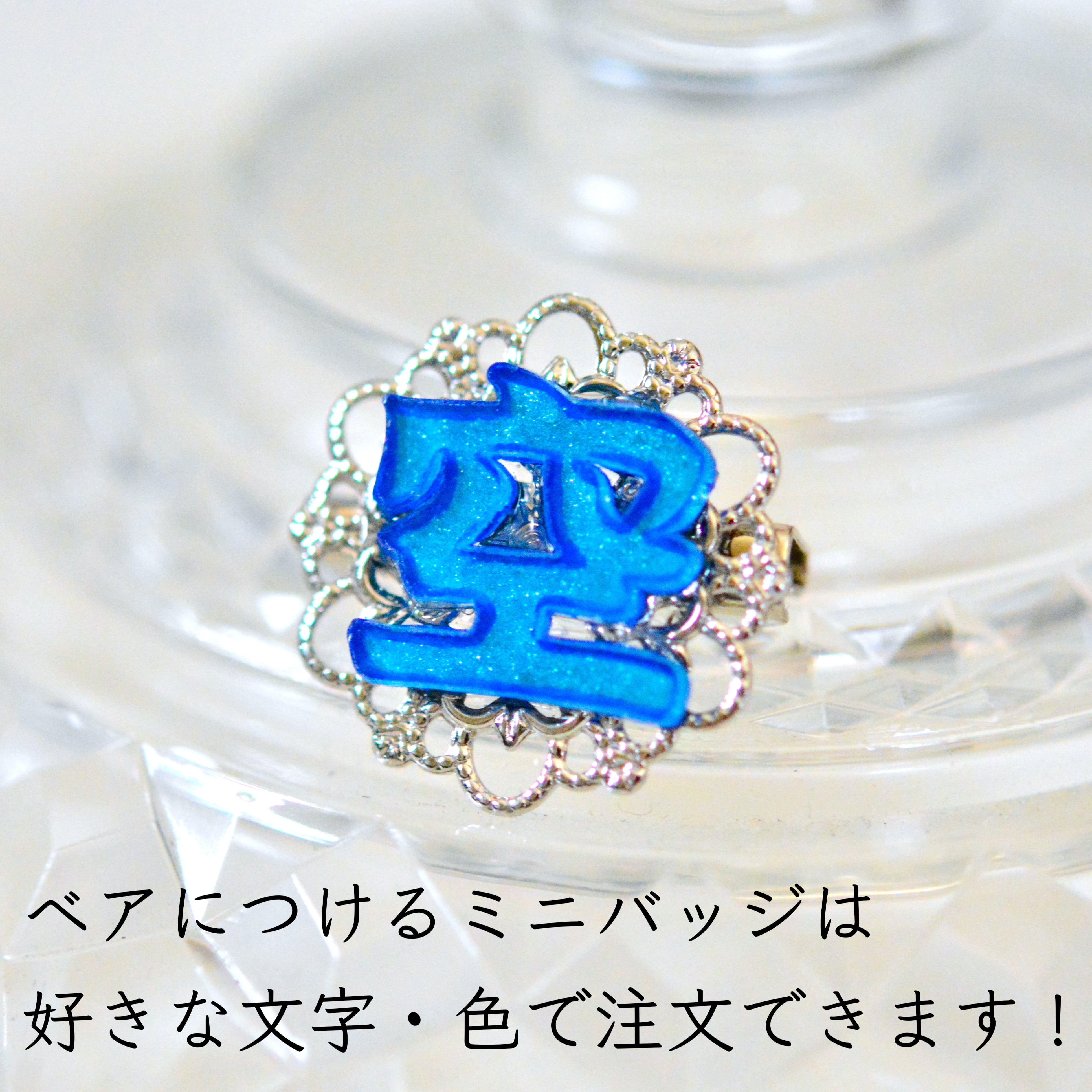 ベアにお付けする文字は好きな文字・色で注文ができます。裏はブローチピンのようになっているので、簡単に付け外しも可能です!