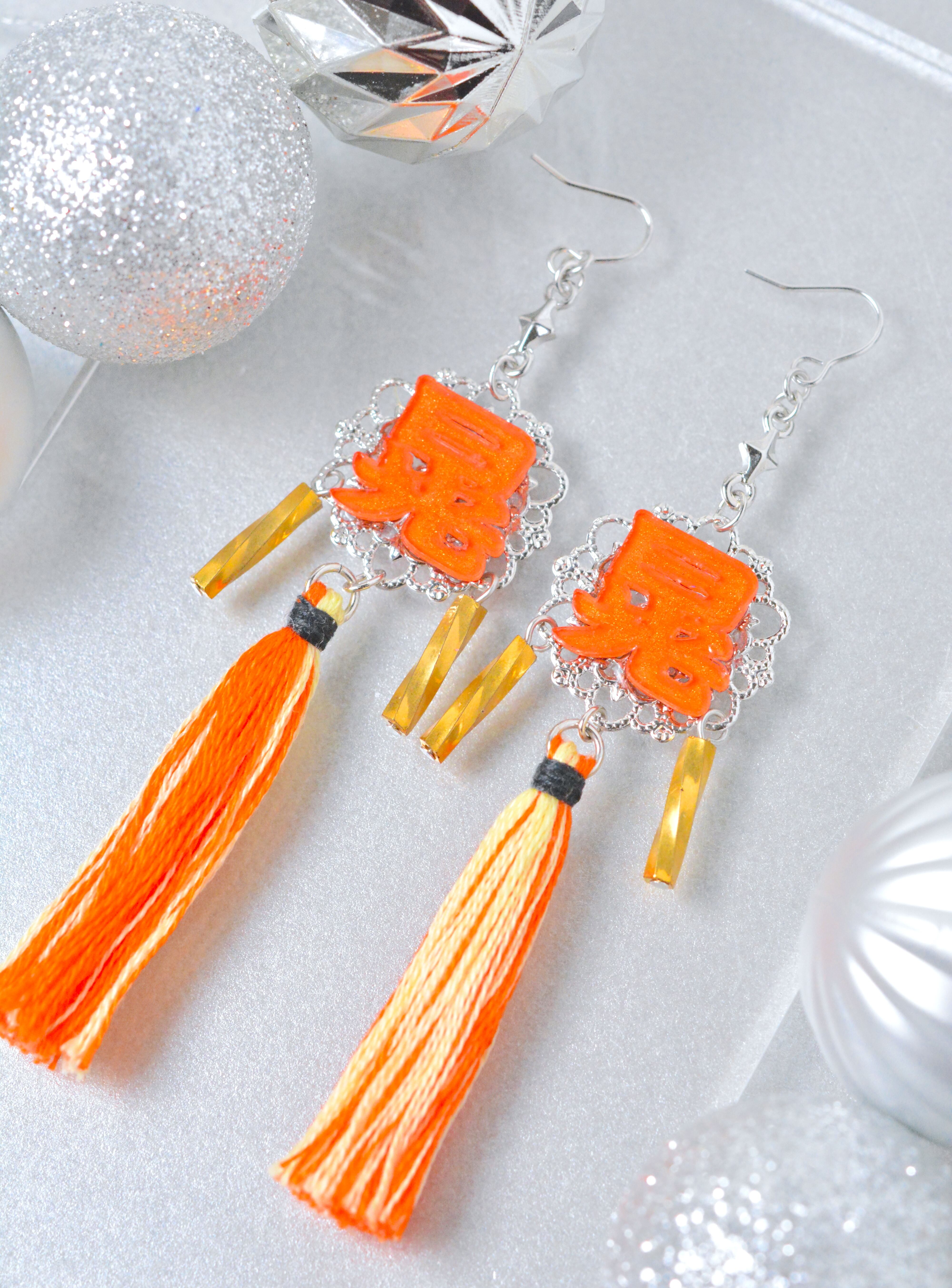 そこでオレンジ系のタッセルとゴールドのビーズ、また漢字の上には♢型のパーツを合わせて温かく光り輝いているイメージの作品にしました。